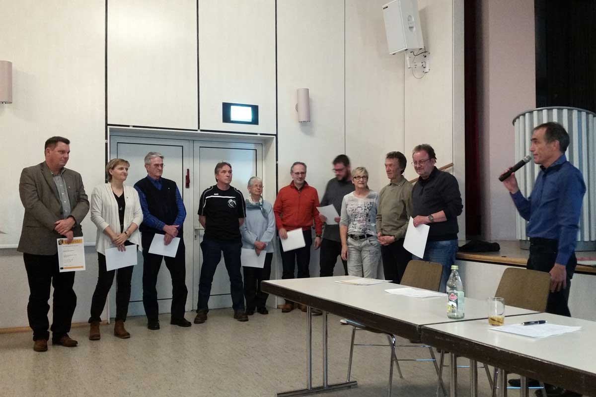 Danach war es den Vorsitzenden Werner Scholpp und Erich J. Bannert eine Ehre, folgenden Mitgliedern Ehrennadeln zu überreichen: Bronze für 20 jährige Mitgliedschaft an Jutta Beck, Elke Gratz, Beate und Axel Kiefer, Uta Lehr, Klaus Schembera, Elvira Schneider, Michael Sommerfeld, Renate Stefanie, Maria Wild sowie Gerlinde Ruf als Übungsleiterin. Silber für Helmut Stulhofer sowie Peter Krüger für seine langjährige Übungsleitertätigkeit im Karate. Gold erhielten für 40-jährige Vereinszugehörigkeit Edeltraud Rau und Stefan Heuberger. Eine Anerkennungsurkunde erhielten Kai Thomas und Werner Vosseler für ihren unermüdlichen Einsatz am Sportgelände.