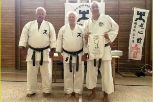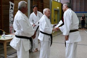 Ein weiterer Termin war die 1. DAN Prüfung unseres Mitgliedes Stefan Schmidt-Salostowitz. Aufgrund diverser Ausfälle privater Natur konnte er nicht gemeinsam mit seinen Vereinskollegen an deren DAN Prüfung, vor zwei Jahren, antreten. Das bedeutete für ihn, den langen Weg der Vorbereitung (i.d. Regel etwa ein Jahr) alleine zu gehen. Für eine solche Prüfung wird ein Partner benötigt, der ebenfalls bereit sein muss, dieses Vorbereitungsjahr zeitlich zu investieren. Einen solchen Partner hat Stefan mit unserem Jugendtrainer Uwe Gebhardt gefunden. Unermüdlich trainierten die Beiden ihr Programm. Zwischendurch wurden von Peter Krüger, verantwortlich für das Erwachsenen Training, immer wieder Begutachtungen in Form von Sondertrainings angesetzt. Stefan erlebte in dieser Phase all die üblichen Tiefen und Höhen, die aber mit einer sauber präsentierten Prüfung ihren erfolgreichen Abschluss nahm. Im Bild Stefan bei Entgegennahme des DAN Diploms, sowie mit zwei seiner Prüfer.