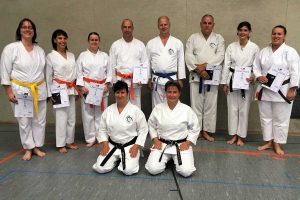 Auf den Prüflingen selbst lastete natürlich, trotz intensiver Vorbereitung durch unsere Trainerinnen Hanne Fleckenstein und Connie Allgaier (im Bild sitzend), die nicht berechenbare Nervosität, die sich zu Prüfungsbeginn auch tlw. in den gezeigten Leistungen wiederspiegelte. Für solche Fälle sind wir aber vorbereitet und haben uns entsprechende Handlungsmuster antrainiert. Am späten Abend, und nach gegenseitiger Sichtung der jeweiligen Aufschriebe, konnten die Prüfer dann allen Prüflingen zum bestandenen, neuen Kyu Grad gratulieren.